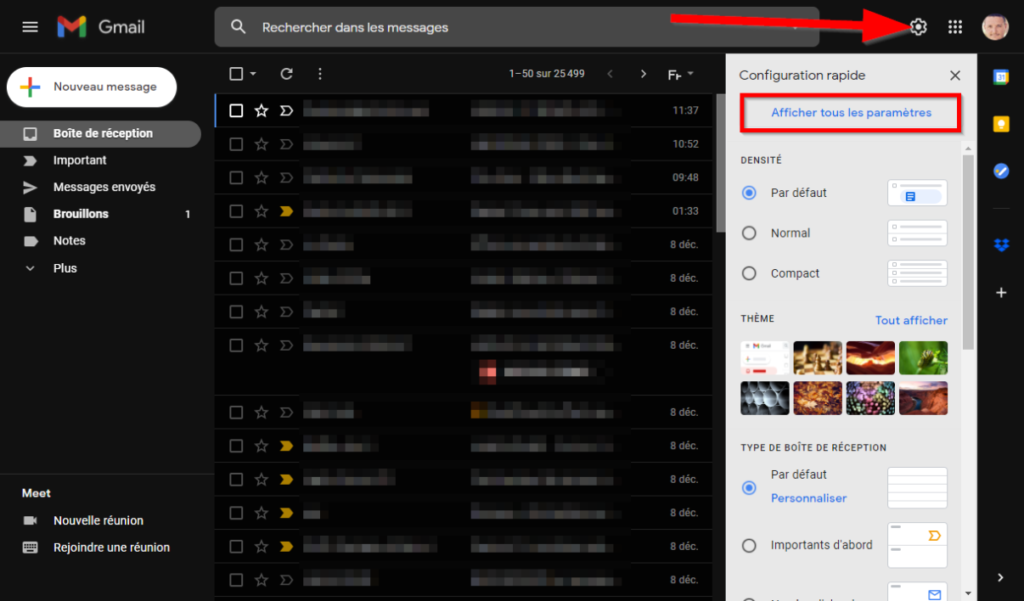 Connectez-vous à votre compte Gmail, cliquez sur l’icône figurant une roue crantée en haut à droite de votre boîte de réception, et choisissez d’Afficher tous les paramètres.