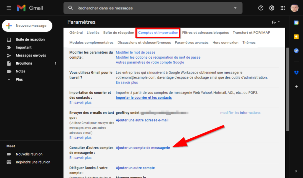 Rendez-vous ensuite dans l’onglet Comptes et importation. Repérez la ligne Consulter d’autres comptes de messagerie, et cliquez sur Ajouter un compte de messagerie.