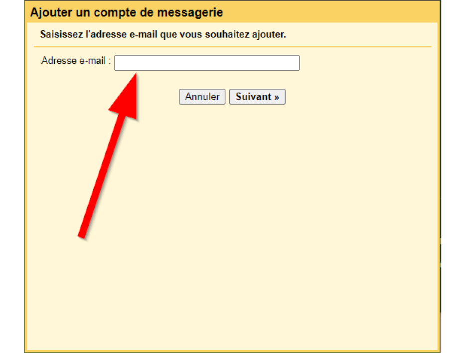 Dans la fenêtre qui s’ouvre, renseignez l’adresse de messagerie que vous souhaitez importer et cliquez sur Suivant.