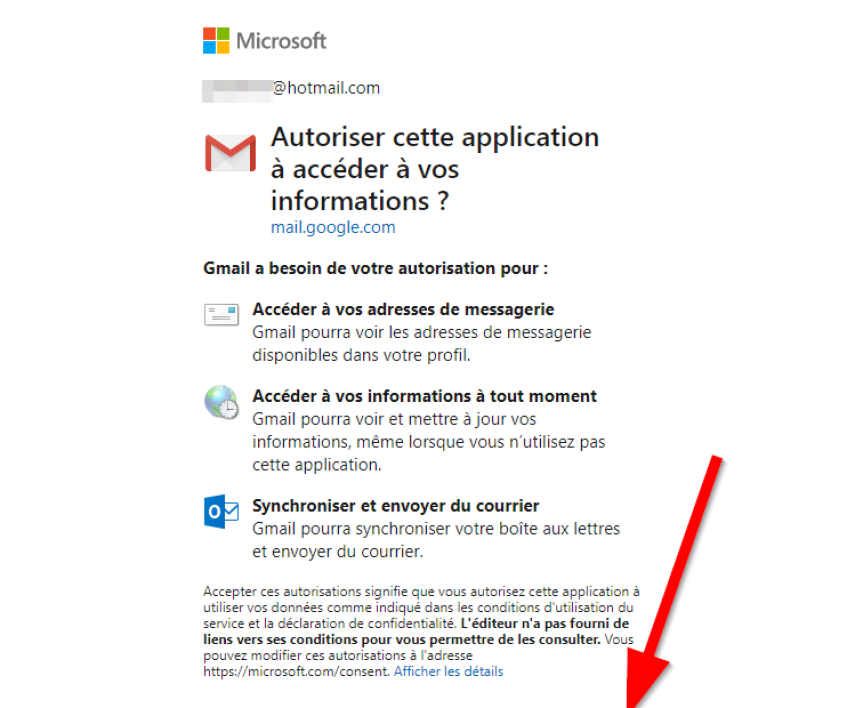 Une nouvelle fenêtre vous invitant à Autoriser Gmail à accéder aux informations de votre messagerie tierce devrait s’afficher. La validation de cette autorisation est essentielle pour que Gmail puisse accéder et gérer votre autre messagerie.