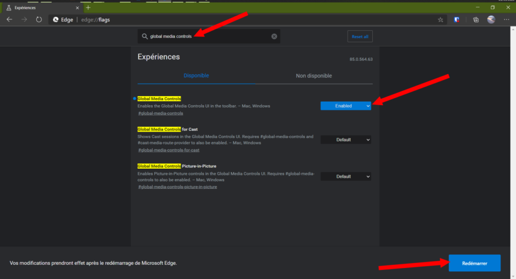 Dans le champ de recherche affiché en haut de l’interface des Expériences d’Edge, recherchez Global Media Controls. Cliquez sur le menu déroulant affiché à droite et changez la valeur Default sur Enabled. Cliquez ensuite sur Redémarrer pour relancer le navigateur web.
