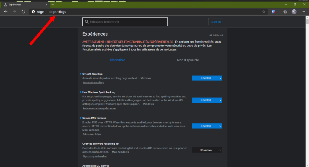 Lancez Microsoft Edge et rendez-vous dans les flags du navigateur en saisissant l’adresse edge://flags