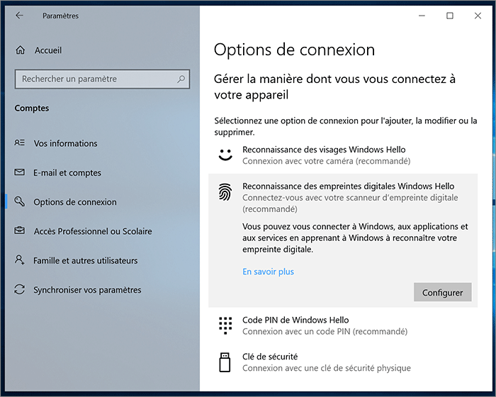 Si votre ordinateur possède un lecture d’empreinte ou une caméra infrarouge compatible, il est possible d’utiliser ces moyens pour vous authentifier très rapidement. A défaut la saisie d’un code PIN à 4 chiffres représente déjà un gain de temps important.