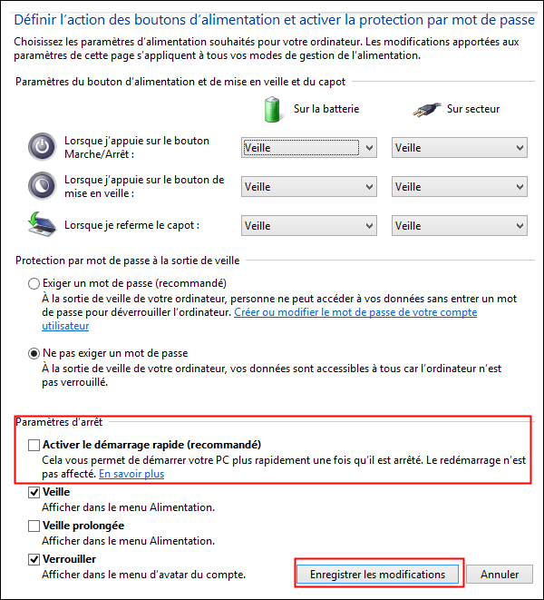 Par défaut le démarrage rapide est activé dans Windows 10. Si vous avez un doute vous pouvez aller vérifier simplement si cette option est bien cochée dans un des recoins des paramètres de l’ancien panneau de configuration. Encore faut-il connaitre son existence et trouver le chemin.